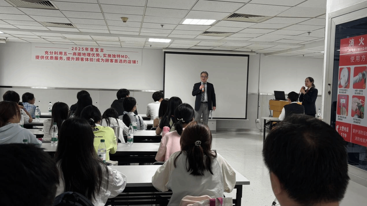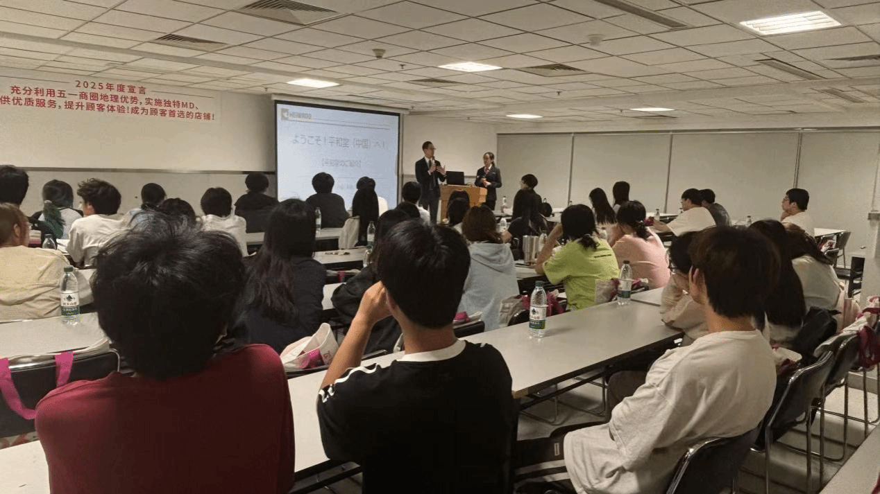 师生一行抵达后,得到了长沙永旺梦乐城总经理菅原基治先生与工作人员的热情迎接。接着,同学们步入了宽敞明亮的会议大厅。总经理菅原先生用日语致辞,对老师同学们的到来表示热烈欢迎,并表达了对校企合作交流的期待。随后,菅原先生通过精心准备的PPT展示,详细介绍了永旺梦乐城在中国的事业布局,包括湖南省的开店计划以及1号店、2号店的具体情况等。从商业设施的规划建设到运营管理,从服务标准到企业文化,全方位地介绍让同学们眼界大开。