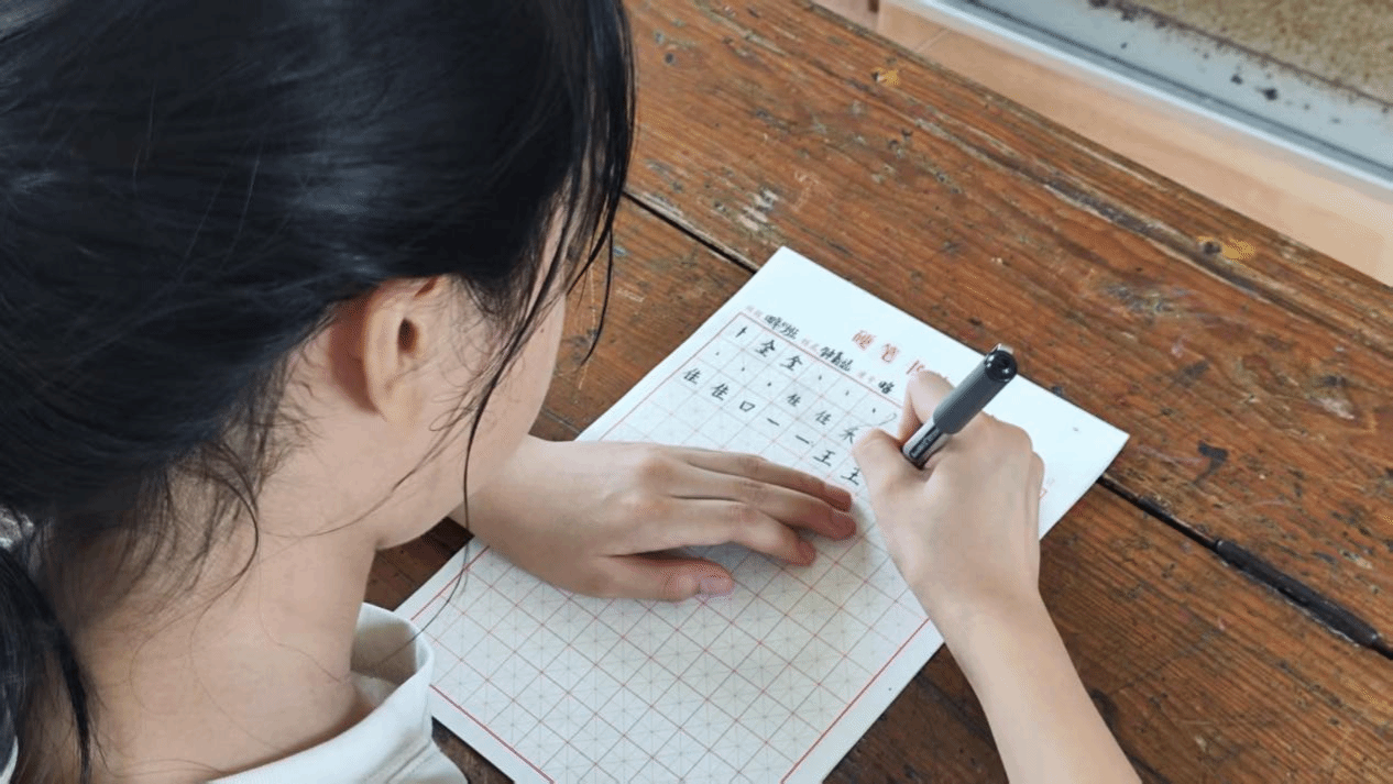 课程伊始,“头抬高,双臂开,脚放平!”开课口令响起,孩子们立刻挺直腰背。支教老师轻托学生手腕,示范“笔拿高、一关节、两点靠”的执笔要诀,铅笔在田字格上落下第一道沉稳的横画。四年级学生李昕在练习本上工整写下“正”字,体会到写字如盖房子,姿势就是地基。教学团队将书法精髓凝练为“正、匀、韧”三字心法——以身正培养仪态,以笔匀锤炼耐心,以锋韧磨砺心性,让品格教育融入基础训练。