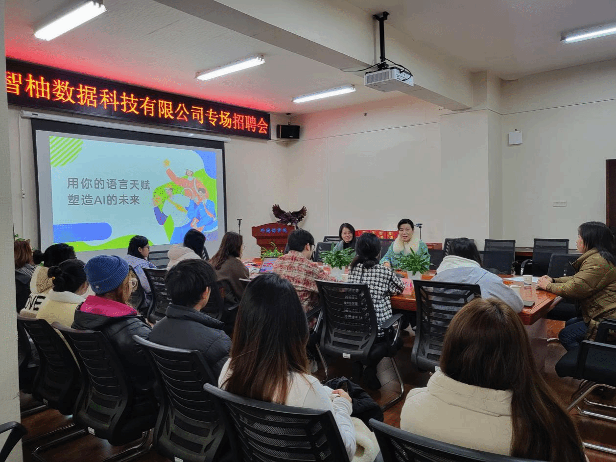 随后,杨继富进行了宣讲,详细介绍了公司的发展历程、核心业务以及未来规划,重点解读了公司在人工智能时代下的数据标注等核心业务板块。针对同学们最为关心的福利待遇、职业晋升通道等问题,企业负责人也进行了全面且细致的解答,展示了企业对于人才的重视与优厚的留才政策。常德智柚数据科技有限公司是此次学院“访企拓岗”行动中对接的重点企业之一,公司目前亟需具备多语种能力的复合型人才。此次专场招聘不仅为学院学生精准拓展了数字经济相关的就业选择,也标志着学院在探索“外语+人工智能”复合型人才培养路径上迈出了坚实的一步。