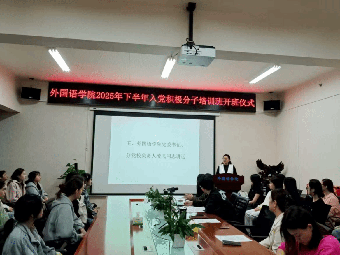 (本网讯)9月25日晚,外国语学院2025年下半年入党积极分子培训班开班仪式在办公楼315-1会议室隆重举行。出席会议的有院党委书记凌飞、党委副书记张鹏、学工办主任肖叶枝、学生第一党支部书记杨舒淇、学生第二党支部书记胡文志、团总支书记代承轩。2025年下半年全体入党积极分子参加开班仪式,会议由杨舒淇主持。