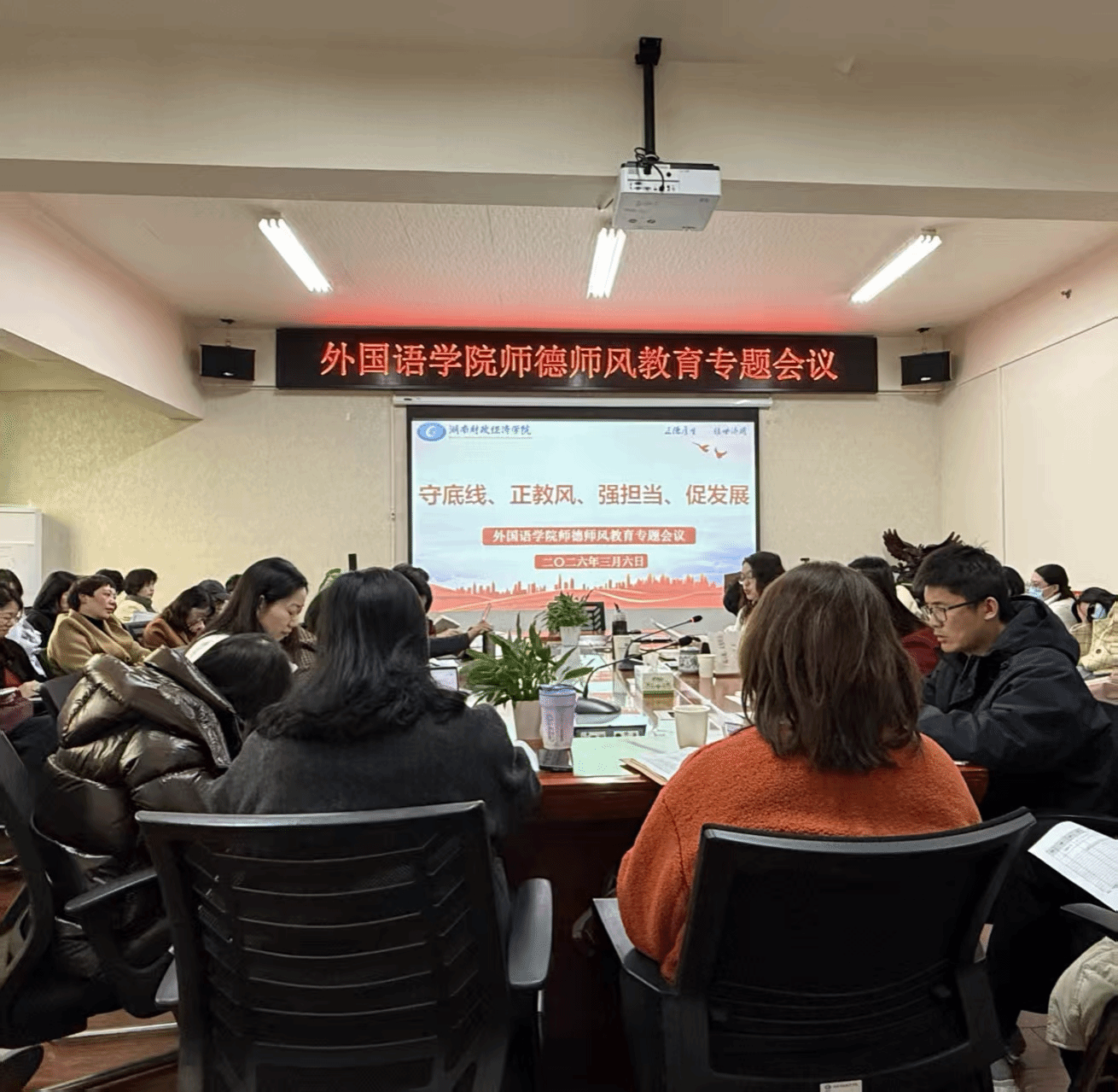 (本网讯)为深入落实学校巡视整改要求,持续铸牢教师思想政治根基,3月6日下午,外国语学院在办公楼315-1会议室召开以“守底线、正教风、强担当、促发展”为主题的新学期师德师风专题教育会。学院全体教职工参会,会议由院党委书记凌飞主持。