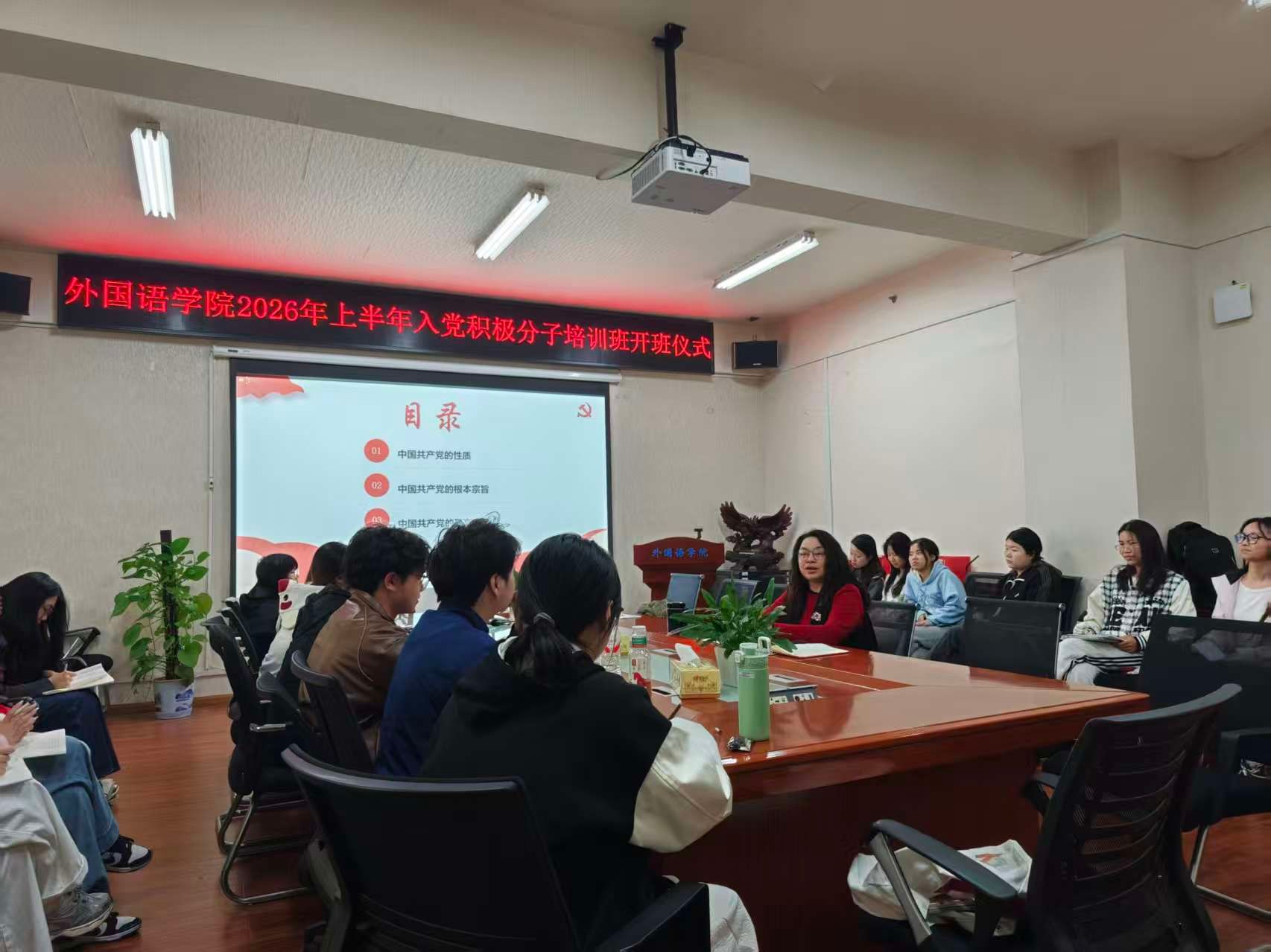 (本网讯)为深入学习贯彻习近平新时代中国特色社会主义思想,切实提升入党积极分子的政治理论素养与党性修养,严把党员发展 “入口关”,4 月 15 日至 16 日,外国语学院 2026 年上半年入党积极分子培训班在办公楼 315 会议室举办,学院党委书记凌飞、副书记张鹏、学院辅导员及全体入党积极分子参加,会议由胡文志主持。