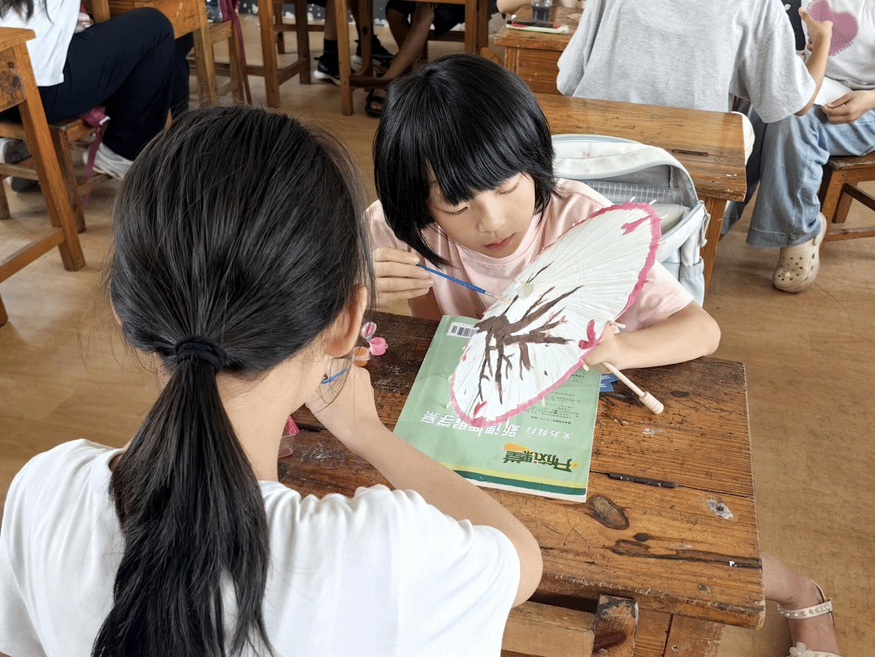 72道古法工序遇见58双稚嫩小手,在浏阳河畔的平水桥完全小学,一场跨越千年的文化对话正在伞面徐徐展开。7月9日,外国语学院“语翼飞翔”志愿服务队以油纸伞为媒,为乡村儿童开启了一扇通往传统文化的任意门。