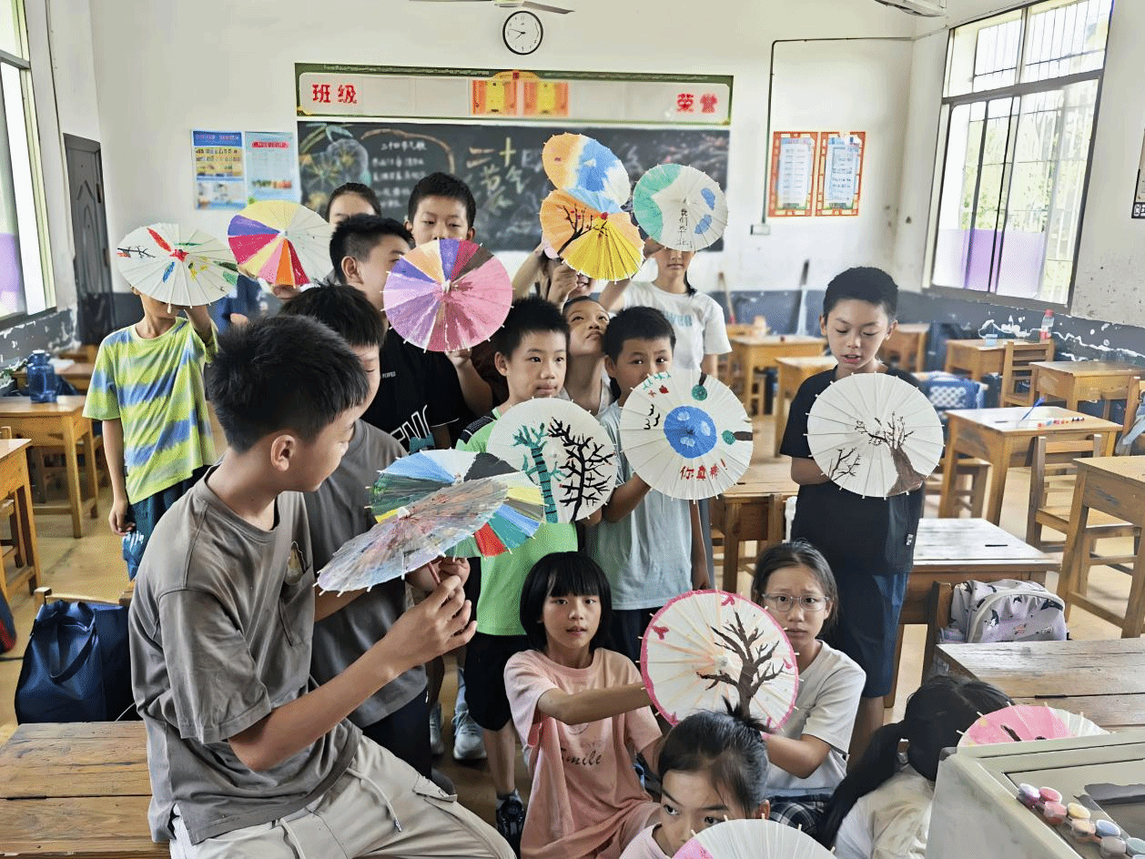 此次非遗课堂实现了传统文化与乡村童趣的完美融合,不仅让孩子们收获了专属油纸伞,更在心中种下了文化基因。孩子们通过亲手创作将书本上的非遗符号转化为可触摸、可体验的文化实践。正如支教队员课堂总结时所说:“我们不是要复制古老技艺,而是让传统在童心里找到新的生长点。”当夕阳为伞面镀上金边,孩子们手中的油纸伞在操场上空撑起一片流动的文化云,那是千年非遗与童年创意共同编织的未来图景。