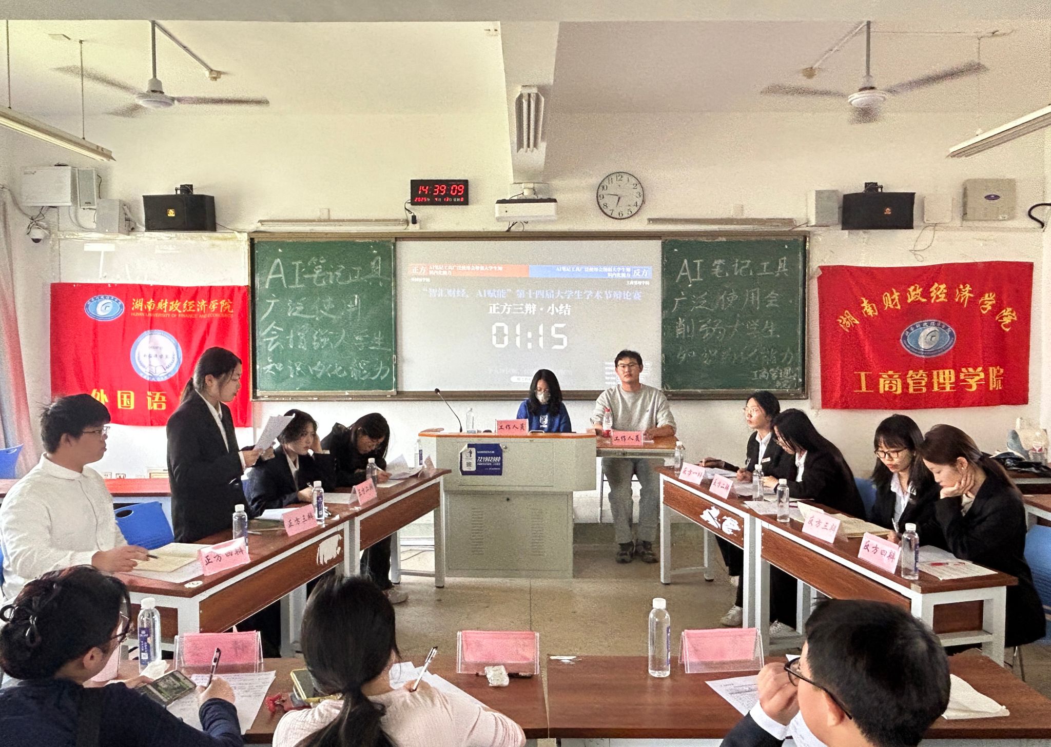 为深化创新人才培养体系,拓展学生科技视野,培育复合型素质人才,4月13日下午2点,外国语学院携手工商管理学院在主校区3501教室成功举办了“智汇财经,AI赋能”主题辩论赛。我院选派张婷、杨骅力、张阳阳和陈静宜四位辩手参加此次辩论赛。