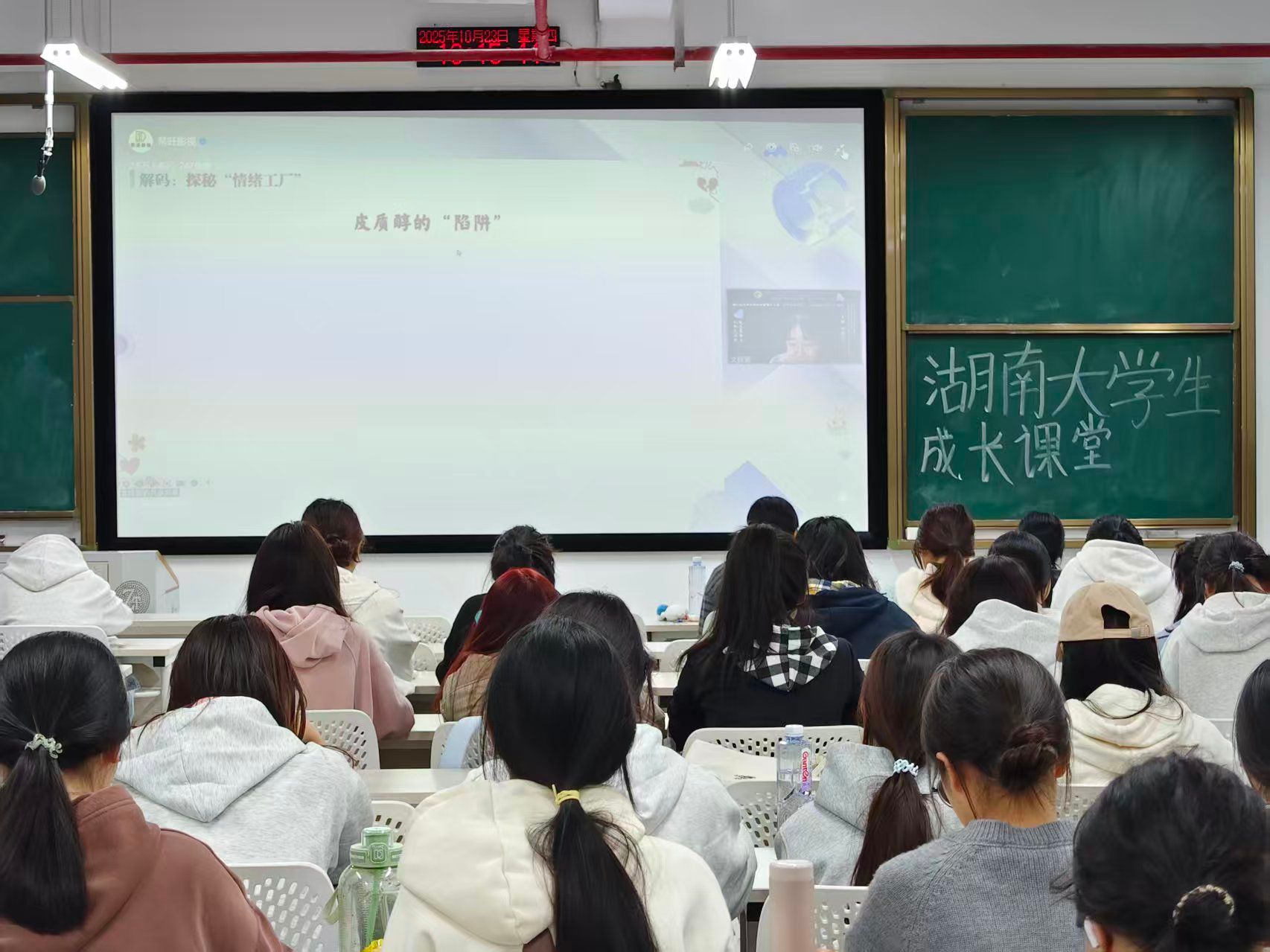 讲座围绕情绪的生成机制、功能价值与调节策略展开系统性讲解,通过生动的案例和科学的理论,引导学生探秘情绪工厂,深入理解情绪产生的生理和心理机制,掌握从对抗到对话的情绪管理策略。讲座内容既具专业性又贴近生活,为日常情绪困扰提供了切实可行的解决思路。各学院认真组织、有序落实,同学们在聆听中积极思考,在交流中深化认识,展现了良好的学习参与度。