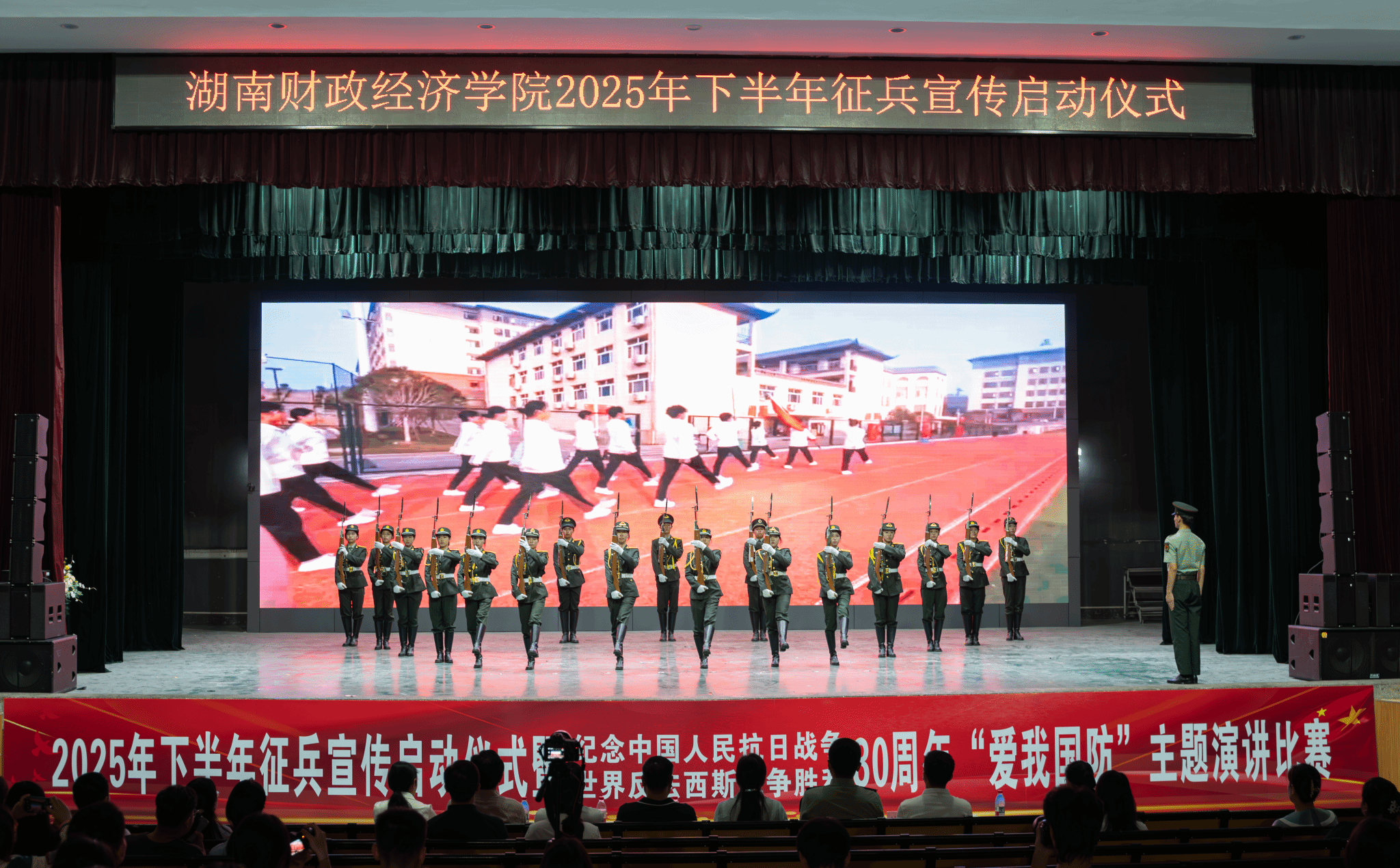 (本网讯)5月14日,世界杯官网2025年下半年征兵宣传启动仪式暨纪念中国人民抗日战争暨世界反法西斯战争胜利80周年“爱我国防”主题演讲比赛在主校区大礼堂举行。校党委副书记苏玲,党委委员、宣传部、统战部部长文炳勋,岳麓区人民武装部部长余岱民出席活动。学生工作部、武装部,招生与就业指导中心,团委负责人,各二级学院学工负责人及学生代表参加。