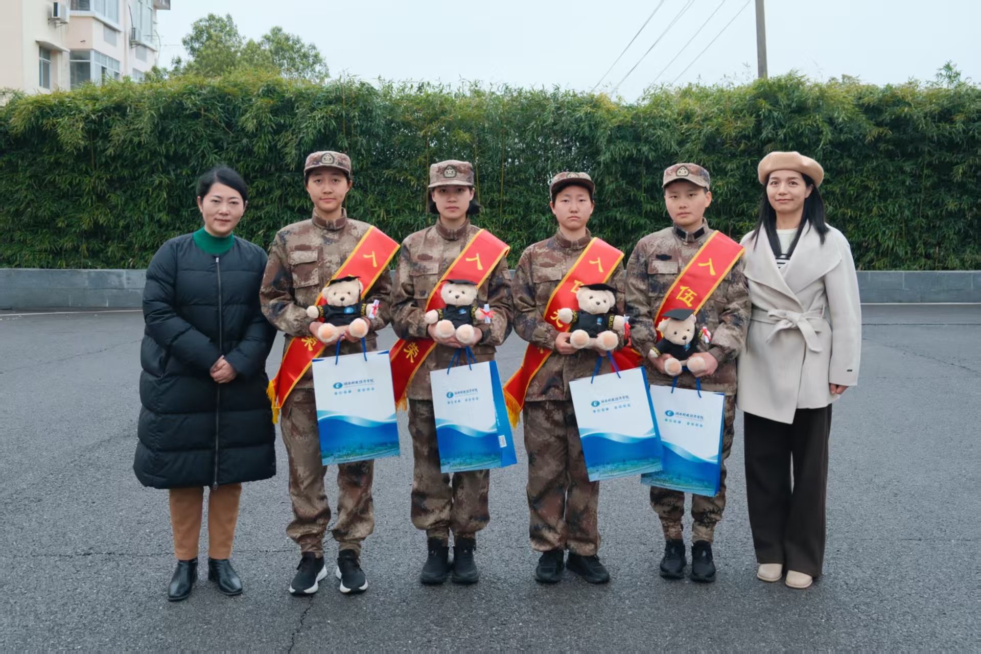 李六华代表学校向光荣入伍的四名女兵表示热烈祝贺。她亲切叮嘱大家要时刻注意安全、保重身体,并勉励她们在军营中锤炼过硬本领、砥砺品德修为。她希望同学们不忘母校培育,牢记“湖财人”身份,将学校的殷切期望转化为从军报国的实际行动,争取早立新功、为校争光。