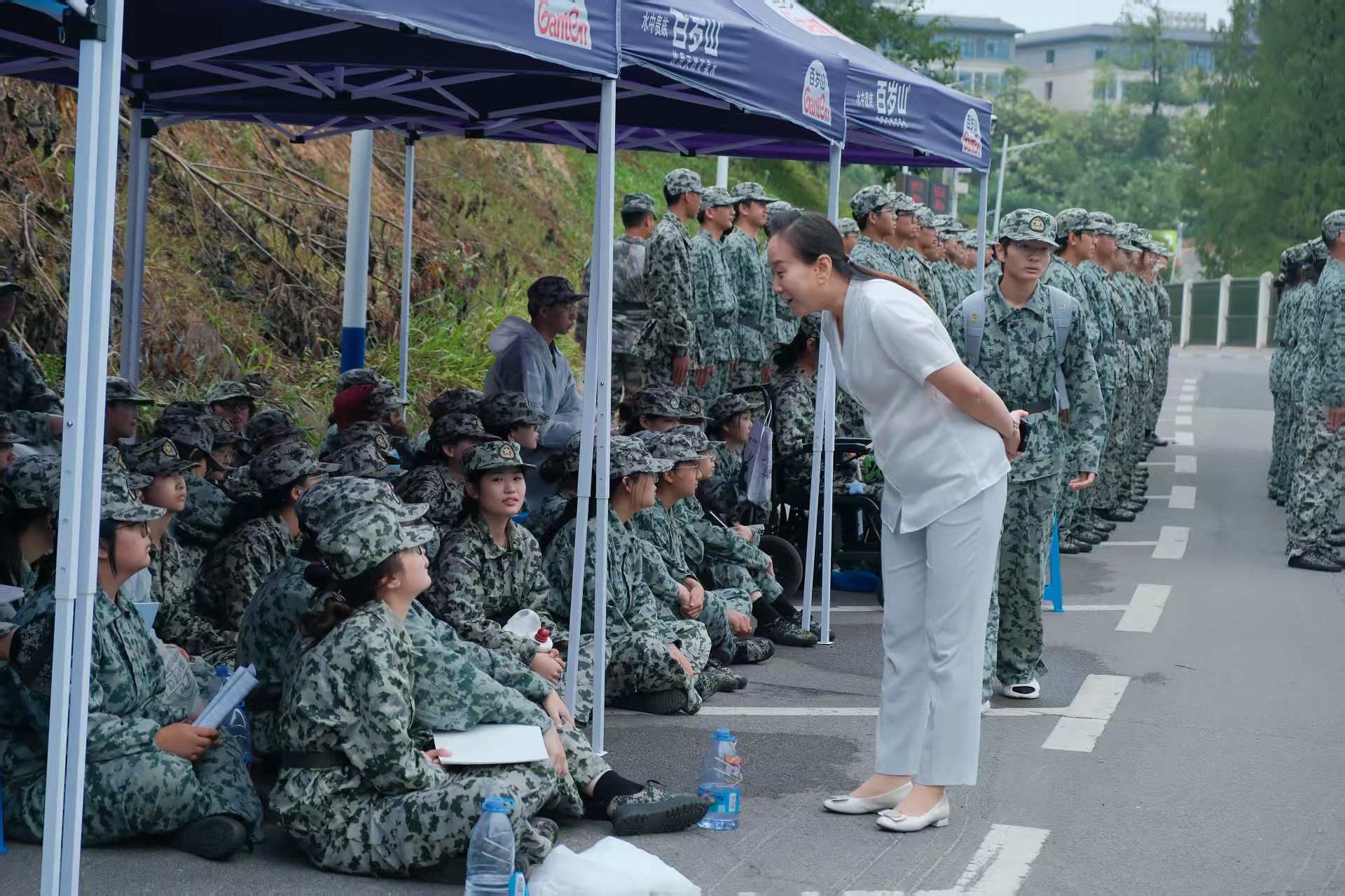 在与新生交流时,苏玲关切地询问同学们的军训感受、适应情况和生活需求,并勉励大家在军训生活中养成良好的生活习惯与作风,系好大学生涯的第一粒迷彩纽扣。苏玲还一一询问了训练场地旁观训学员们的身体情况,鼓励他们首先要照顾好自己的身体,同时要珍惜时间提前适应大学的学习和生活。