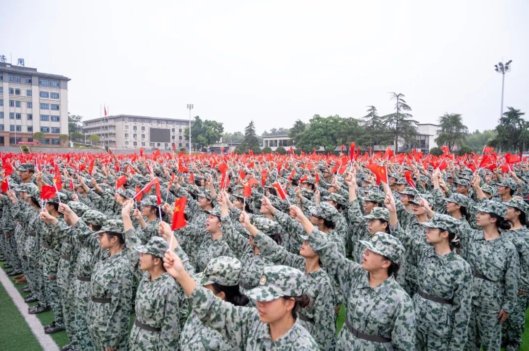 历经14天骄阳与风雨的洗礼,2025级学子完成了从青涩到坚韧的蜕变。军事训练成果汇报表演中,31支分列式方阵步伐铿锵、口号嘹亮,依次正步通过主席台,展现昂扬风貌;擒敌拳方阵招式凌厉、气势如虹,匕首操、刺杀操方阵在战鼓声中迅猛出击,杀声震耳;2050名学生组成的文化方阵先后呈现出“雷锋”“正德厚生 经世济用”“我❤中国”“1933-2025”等图案与字样,齐声宣誓“请党放心,强国有我”,滚烫的誓言彰显着新时代青年的责任与担当。