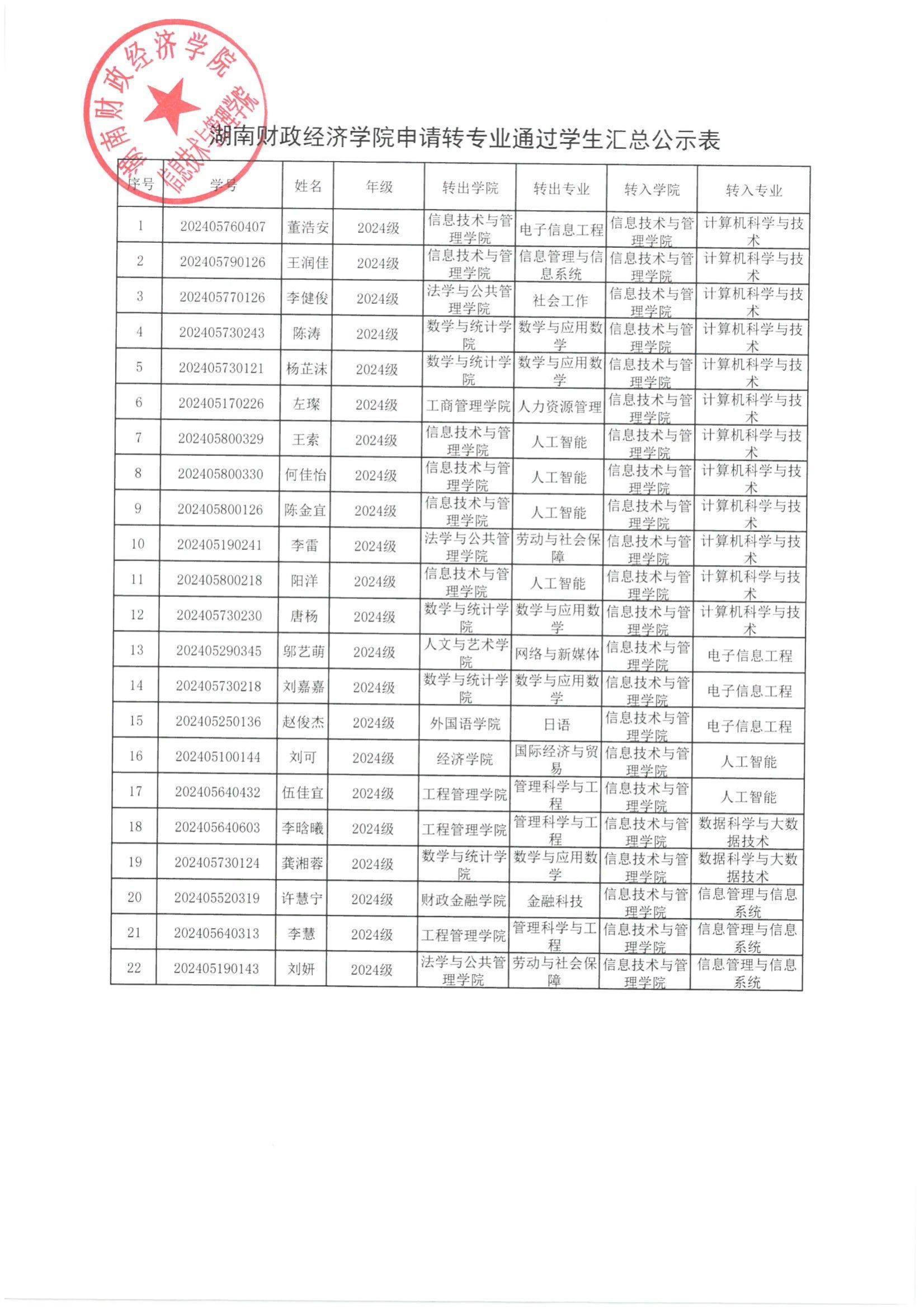 信息技术与管理学院2024年本科生转专业拟录取公示表