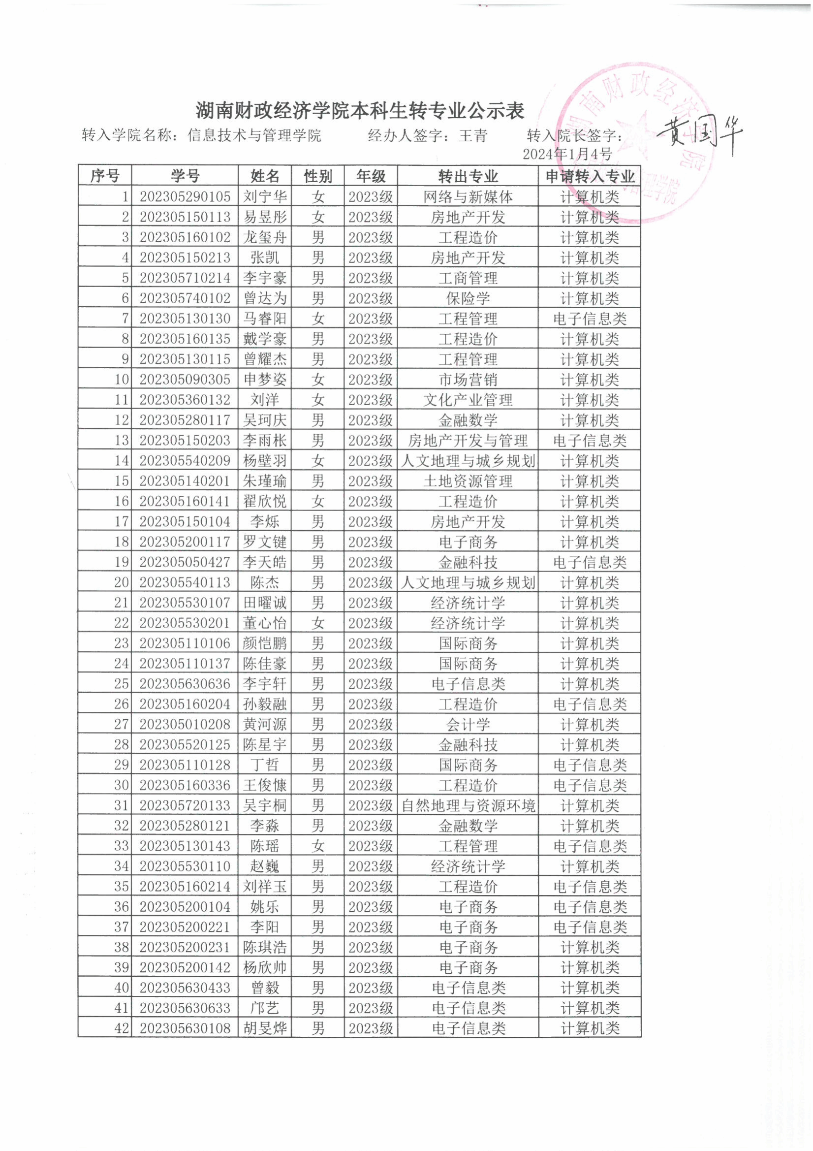 信息技术与管理学院2023年本科生转专业拟录取公示表