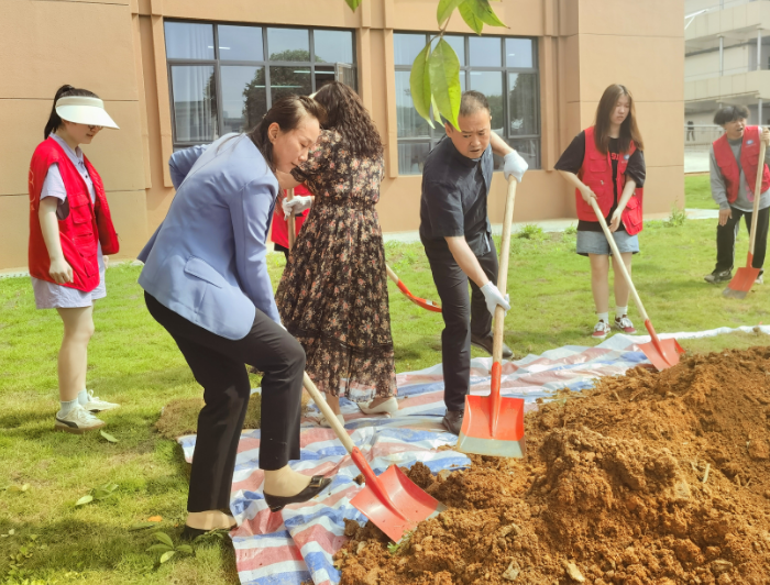 苏玲为龚恒军校友颁发捐赠证书,并带领现场师生一同完成了植树培土工作。走在雷锋校区校道上,龚恒军校友看到来来往往忙碌的学生们,不禁与领导老师们一同回忆起当年在母校读书生活的美好时光。