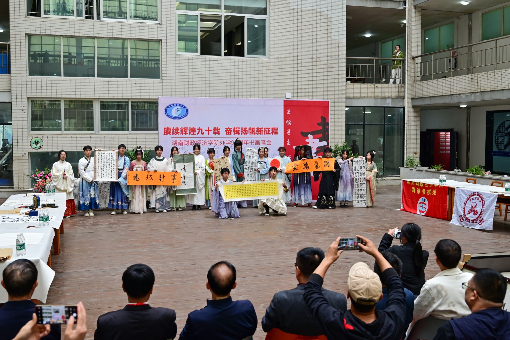 (本网讯)笔墨挥洒韵味,捷思闪烁光泽。为庆祝世界杯官网迎来办学90周年,熏陶校园传统文化气息,10月28日下午,学校在图书馆阅读天井举办“赓续辉煌九十载 奋楫扬帆新征程”主题校友书画笔会。