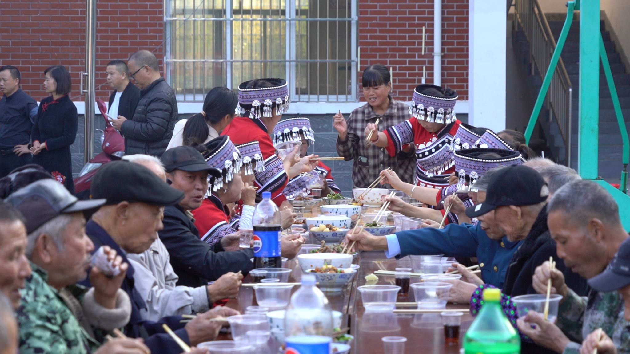 村文化广场上,村民自编自演的歌舞、戏曲节目轮番上演,重阳合拢宴温情开席。工作人员按照“清淡、软烂、营养”原则定制菜单,改良版芷江鸭(炖至脱骨)等本地特色菜品依次上桌,志愿者主动为老人分餐、添饭,让老人们在“舌尖上的温暖”中感受集体关怀。